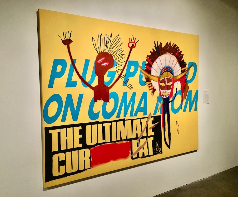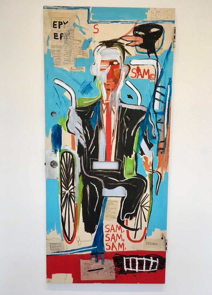 (Before I go any further, I must mention, somewhere in here, Jean-Michel’s portraits of non-celebrities. They are outstanding — he had a remarkable way of capturing a person’s soul, which is no easy thing to do. Jean-Michel told Becky Johnston and Tamra Davis that art dealers “really hated” the portraits, but artists liked them. The artists were right. In 2022, I tracked down a little-known portrait at the Dallas Museum of Art called “Sam F,” a captivating work of a wheelchair-bound businessman named Sam Feldman that Jean-Michel had befriended, in Dallas, in 1985. (Sam’s wife, Helga, told a great story about the session in a 2020 interview. His canvas was a dirty door, and he used Helga’s old paints.) Jean-Michel painted many others, including portraits of Fred Hoffman, Andy Warhol’s one-time love interest Jon Gould, and a photographer-stylist named Michael Patterson. The Patterson portrait, created in 1984 and titled “MP,” went up for auction in 2020. It’s stunning. “Once he captured the eyes,” Patterson said in a video for Christie’s, “that’s when I kind of freaked out. He captured my soul in my eyes.” Like I mentioned before, always check out the eyes… Maybe I missed it, but I’m still waiting for a proper exhibition that focuses only on Jean-Michel’s non-celebrity portraits. It would be fascinating.)