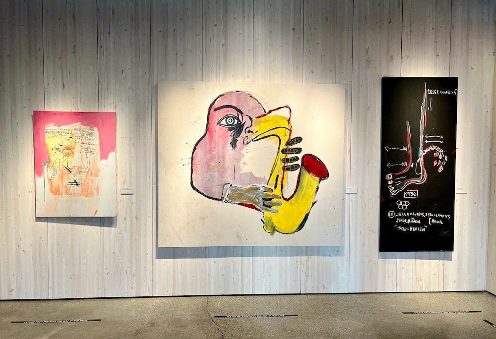 After Gallery Two, on Jean-Michel’s birthday, I walked out to the courtyard for a breather. A staff member waved at me, and we chatted for a bit, then I entered Gallery Three. Its theme was “Royalty,” and the royalty showcased in this space, through Jean-Michel’s paintings, were Black folks: Charlie Parker and Miles Davis, Nat King Cole and Tommy Potter, Sugar Ray Robinson and Jesse Owens, and others. It was Jean-Michel’s way of saying, through his art, that Black folks matter, that Black folks’ contributions to America matter, that Jean-Michel won’t allow Black folks and their contributions to be erased. After all, Black history is American history — the two aren’t separate.
