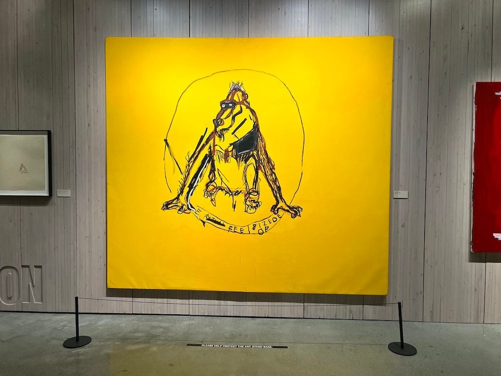 The one painting, in this room, that always pulled me in is Dry Cell from 1988. It’s big — around eight feet by nine feet — with a yellow background that pops. In the middle of it is a portrait of a mandrill — a large West African baboon. What grabbed me, every time, is the pride and stateliness of the mandrill. You can feel it, beaming out of the mandrill’s eyes — for me, the eyes are key in many of Basquiat’s artworks… it was the way he created a vibe for a piece… always check out the eyes. Dry Cell, his family said, is one of the last paintings Jean-Michel completed before his death.