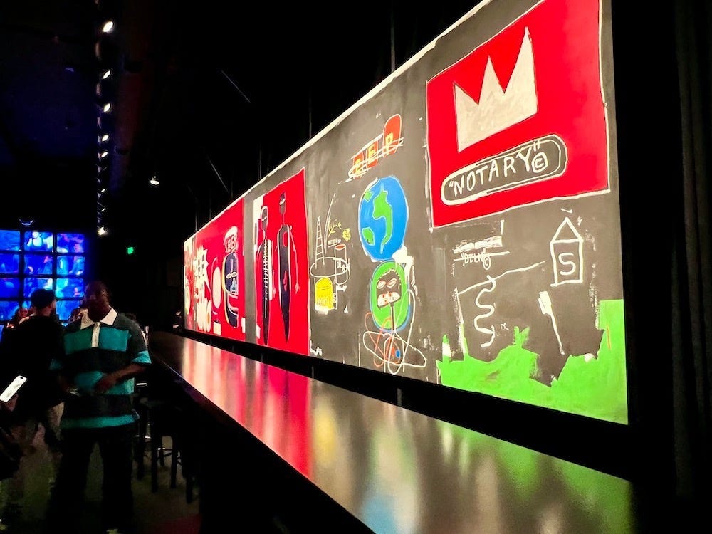 Then I walked down a hallway and the sisters welcomed me through a looped recording that was boomed out from another overhead speaker: “Hi! This is Jeanine. And this is Lisane. Welcome to the Jean-Michel Basquiat: King Pleasure exhibition. Step forward for an intimate glimpse into the life and journey of Jean-Michel Basquiat.”