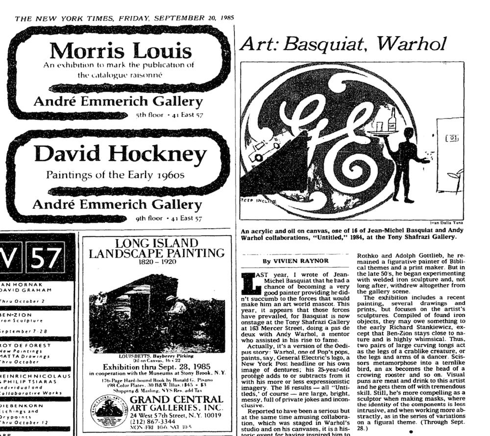 Fred Hoffman, in The Art of Jean-Michel Basquiat, has his own take on Jean-Michel’s comments to Johnston and Davis — an interview that took place several months after Vivien Raynor’s nasty review of the Warhol-Basquiat show.